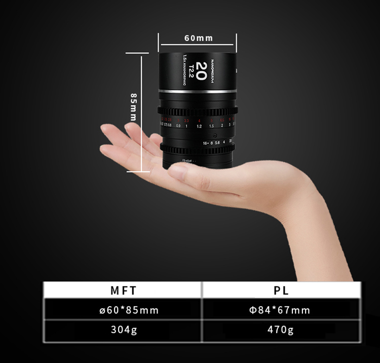 Nanomorph 20mm T2.2 MFT is specifically designed for cameras featuring MFT sensors. It is NOT meant for Super35+ sensors as opposed to our other Nanomorph focal lengths (27/35/50/65/80).