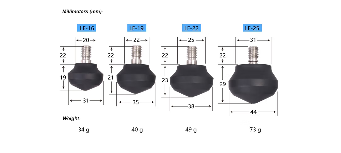 - Set of 3 non-slip rubber tripod feet including a stainless steel connector with universal 1/4" or 3/8" thread.
