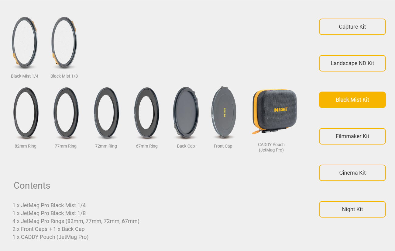 For added convenience, the kit has two front caps, one back cap, and a JetMag Pro Caddy Case to protect and organize your filters and accessories. Whether you’re shooting portraits or videos or creating cinematic effects, the NiSi JetMag Pro Black Mist Kit helps you achieve that professional, soft-focus look with ease.