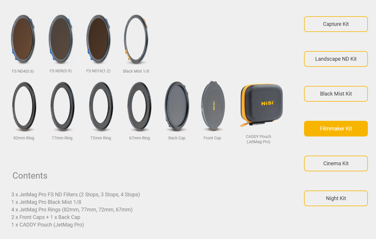 The NiSi JetMag Pro Filmmaker Kit is an all-in-one solution for filmmakers and photographers looking to control light, reduce reflections, and add a cinematic touch to their footage. The kit includes three FSND filters—FS ND4 (2 Stop), FS ND8 (3 Stop), and FS ND16 (4 Stop)—designed to give you precise control over exposure, allowing for long exposures and depth-of-field adjustments even in bright conditions. Additionally, the kit features the Black Mist 1/8 Filter, which softens light, reduces contrast, and adds a subtle halation effect around highlights, ideal for achieving a cinematic look in both photography and videography.