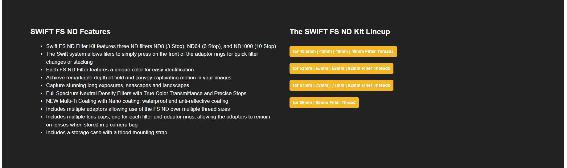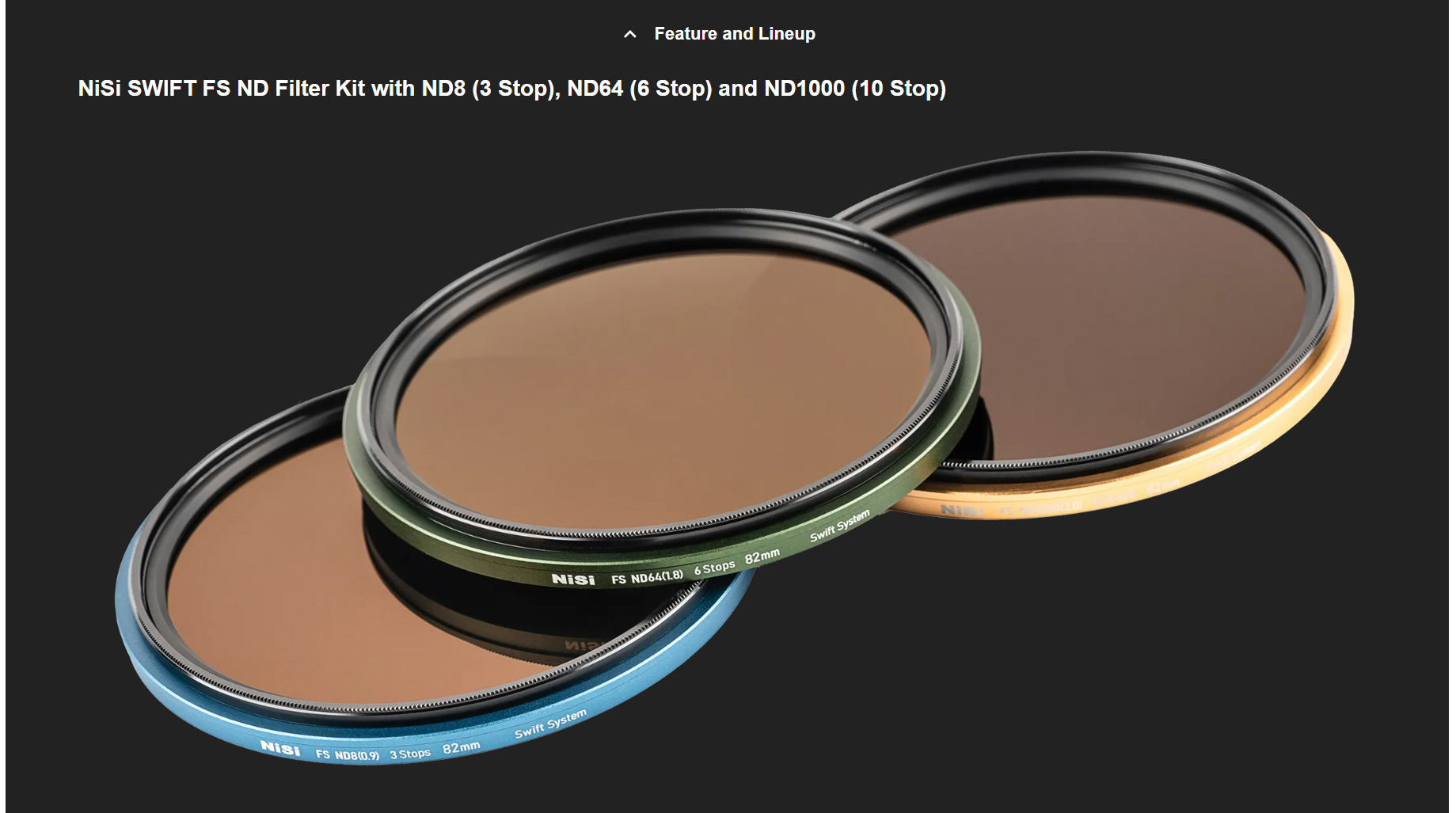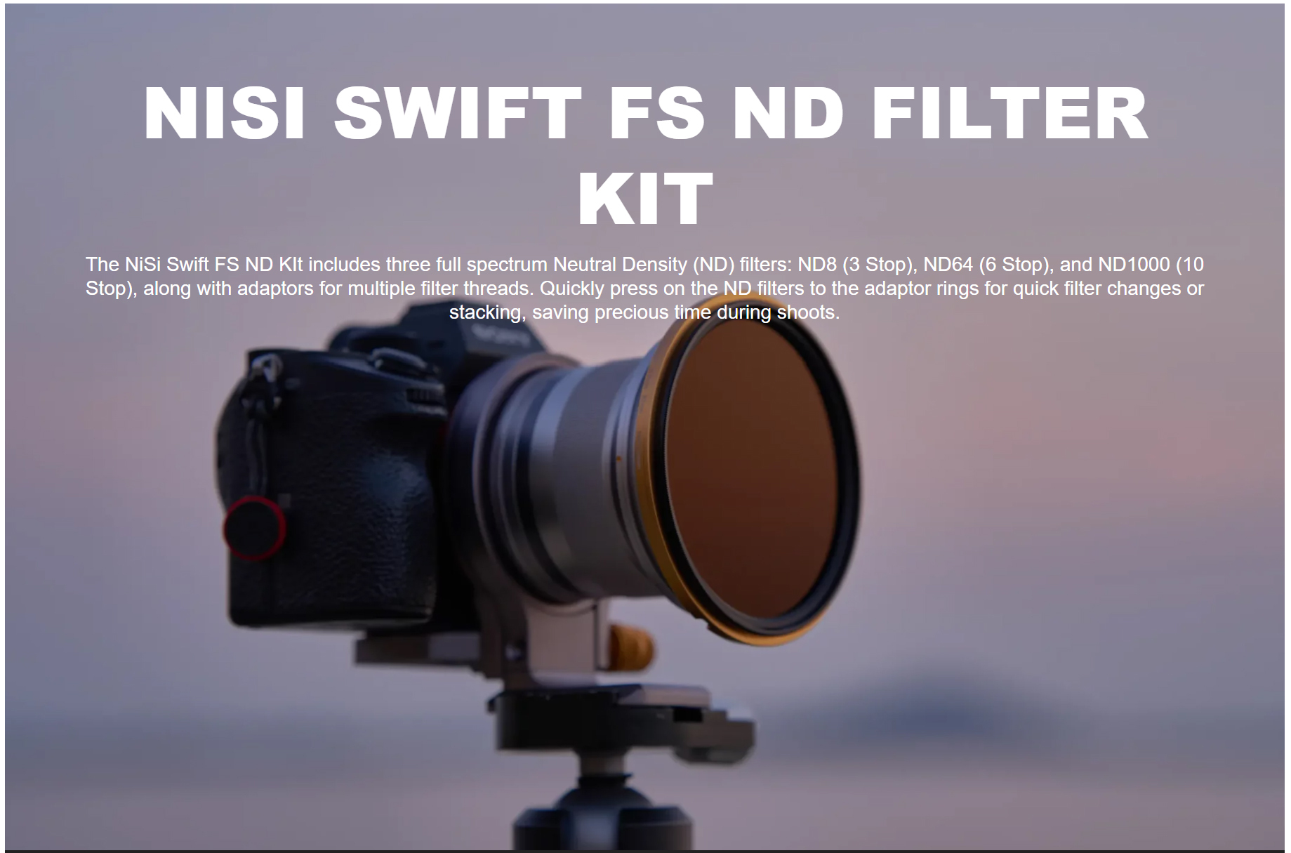 - Swift FS ND Filter Kit features three ND filters ND8 (3 Stop), ND64 (6 Stop), and ND1000 (10 Stop)