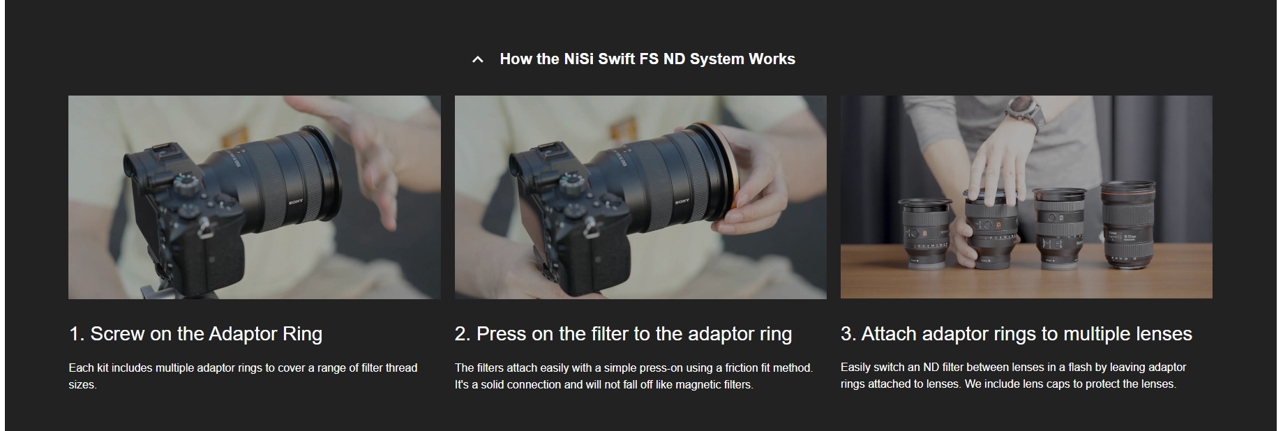 - The Swift system allows filters to simply press on the front of the adaptor rings for quick filter changes or stacking
