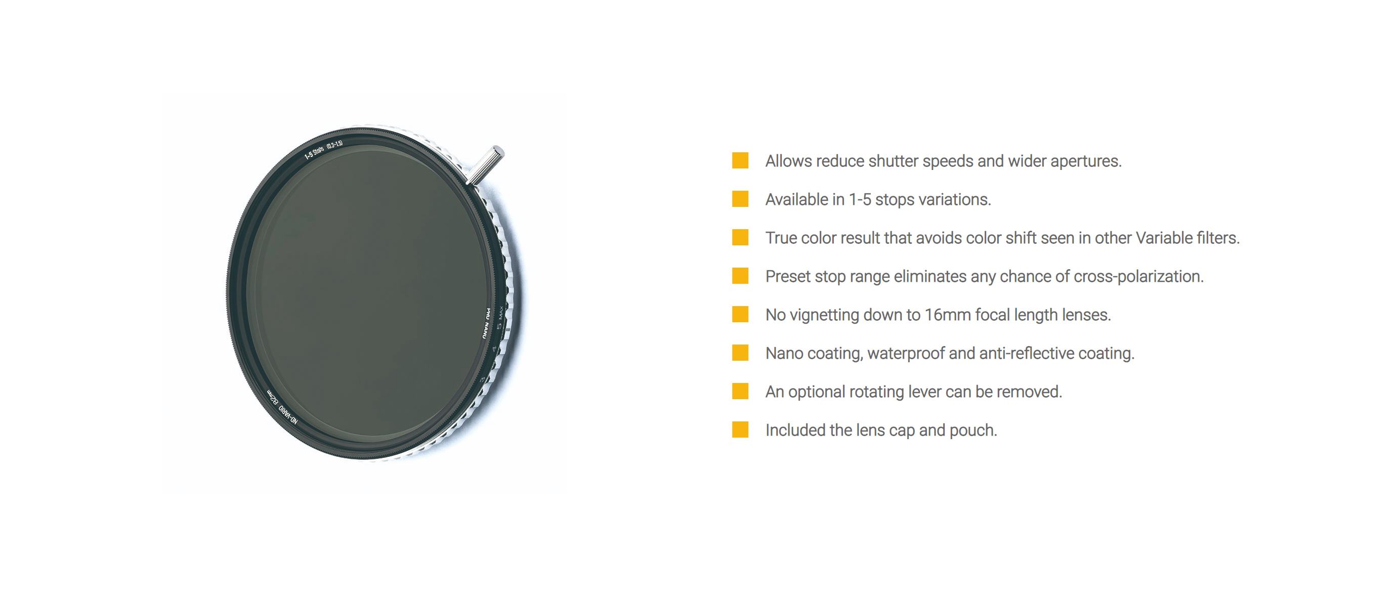 The NiSi True Color ND-VARIO Pro Nano 1-5stops Variable ND is provides an exposure reduction of 1 to 5 stops. The 0.3 to 1.5 density creates a darkening of the entire image, allowing wider apertures or slower shutter speeds than usually possible. The degree of density is easily controlled by rotating the front filter ring with or without the included silver lever, helping you predetermine the additional exposure length required. By slowing your exposure time or increasing your aperture, you can control the depth of field and convey movement more easily. The transition of density occurs smoothly which allows the photographer or videographer to adjust exposure length to the exact amount required for a given scene. For easier, repeatable control over density settings, the front ring is visually marked with numbers representing the different stop values. The ring features silver side knurlings for a secure grip and easy installation and removal. For those using this filter with cinema or video cameras, combined adjustments of aperture and this filter allow fine adjustments of the depth of field while retaining the designated frame rate.