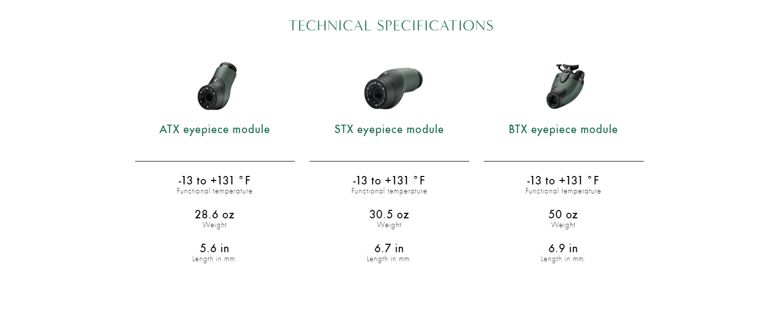 The BTX eyepiece module is compatible with all objective lenses in the SWAROVSKI OPTIK ATX/STX range. Existing objective modules can be upgraded to a fully-fledged BTX spotting scope.