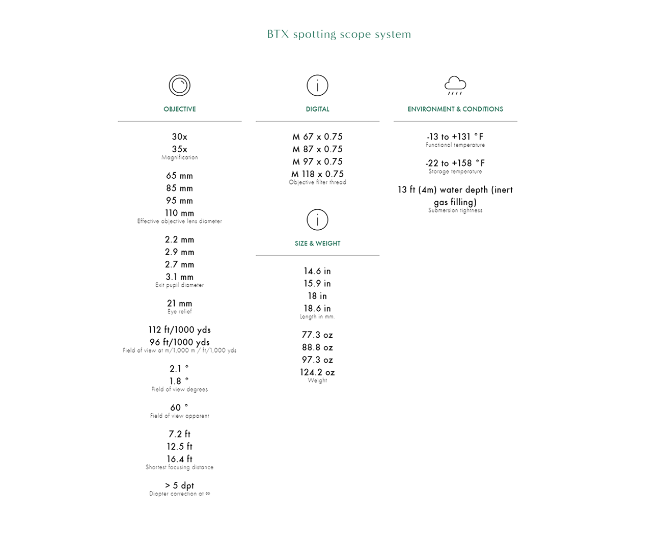 The BTX eyepiece module is compatible with all objective lenses in the SWAROVSKI OPTIK ATX/STX range. Existing objective modules can be upgraded to a fully-fledged BTX spotting scope.